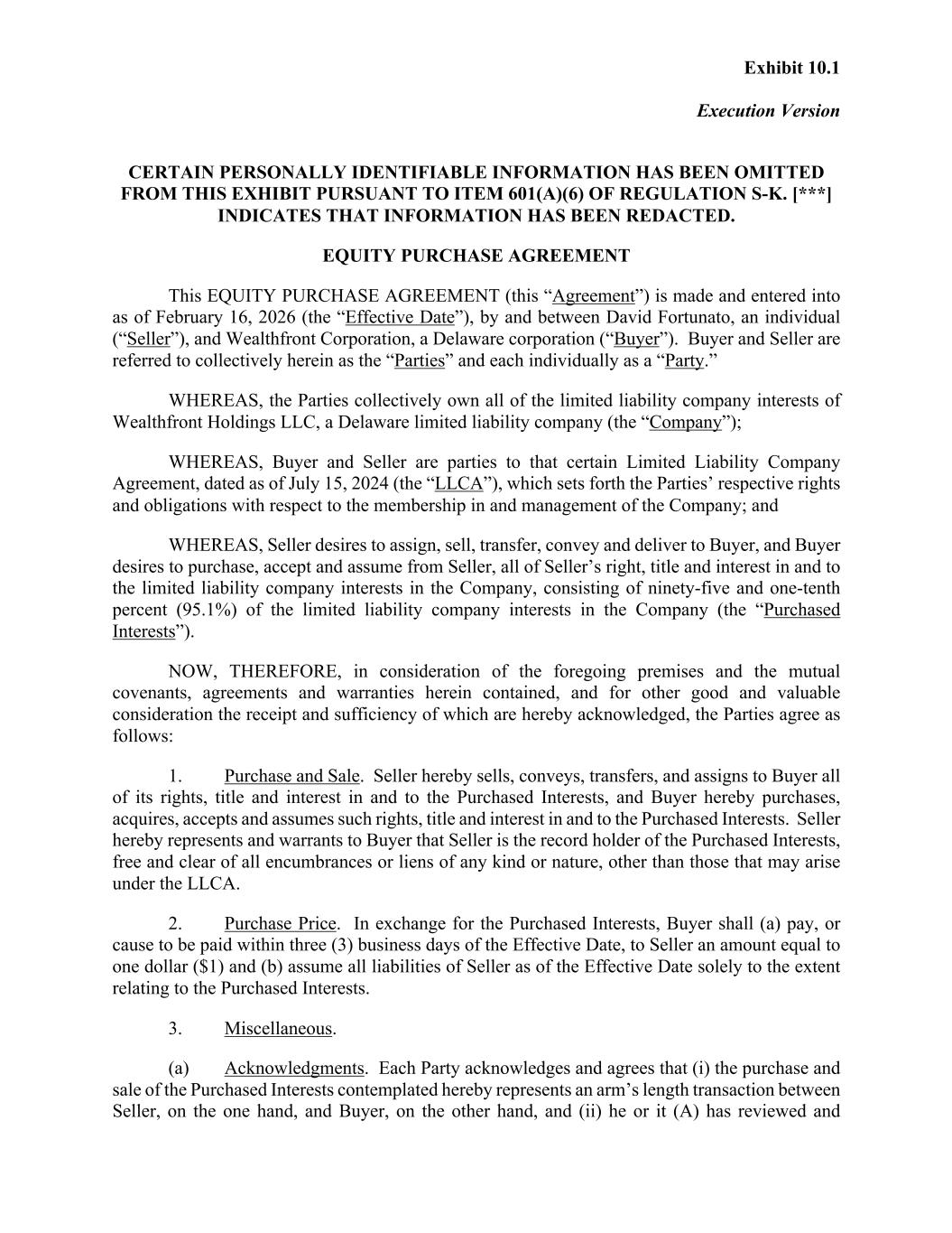 The Company entered into an Equity Purchase Agreement with David Fortunato, the Company’s Chief Executive Officer and President, attached hereto as Exhibit 10.1 (the “Purchase Agreement”). Pursuant to the Purchase Agreement, the Company acquired the entirety of Mr. Fortunato’s limited liability company interest in Wealthfront Holdings LLC, the sole member of Wealthfront Home Lending, representing 95.1% of the aggregate limited liability company interests of Wealthfront Holdings LLC (the “Ownership Interest”), for nominal consideration in the amount of one dollar ($1). Following this transaction, the Company became the sole owner of 100.0% of the limited liability company interests of Wealthfront Holdings LLC. As a wholly-owned subsidiary of Wealthfront Holdings LLC, Wealthfront Home Lending is now an indirect wholly-owned subsidiary of the Company.
